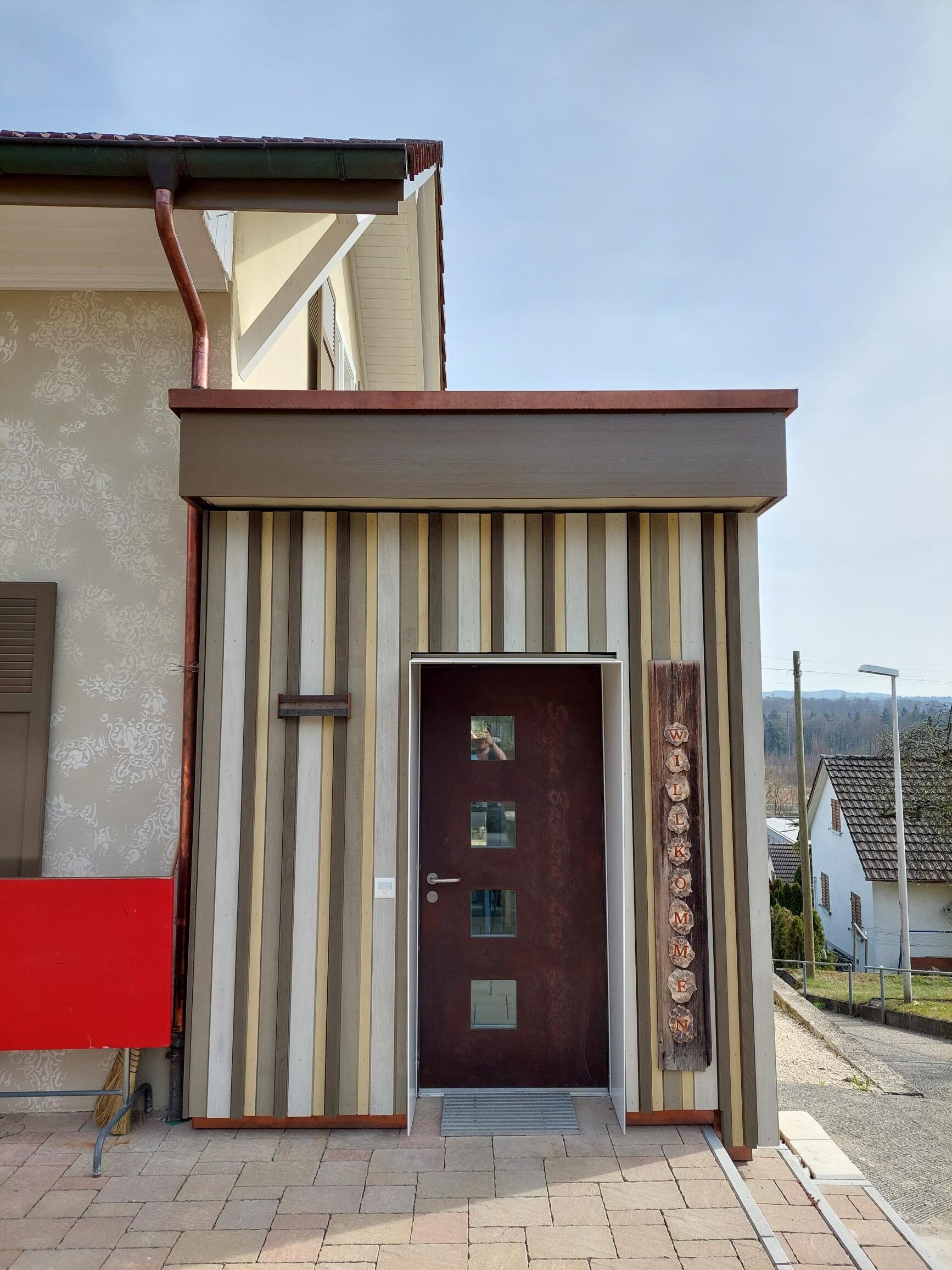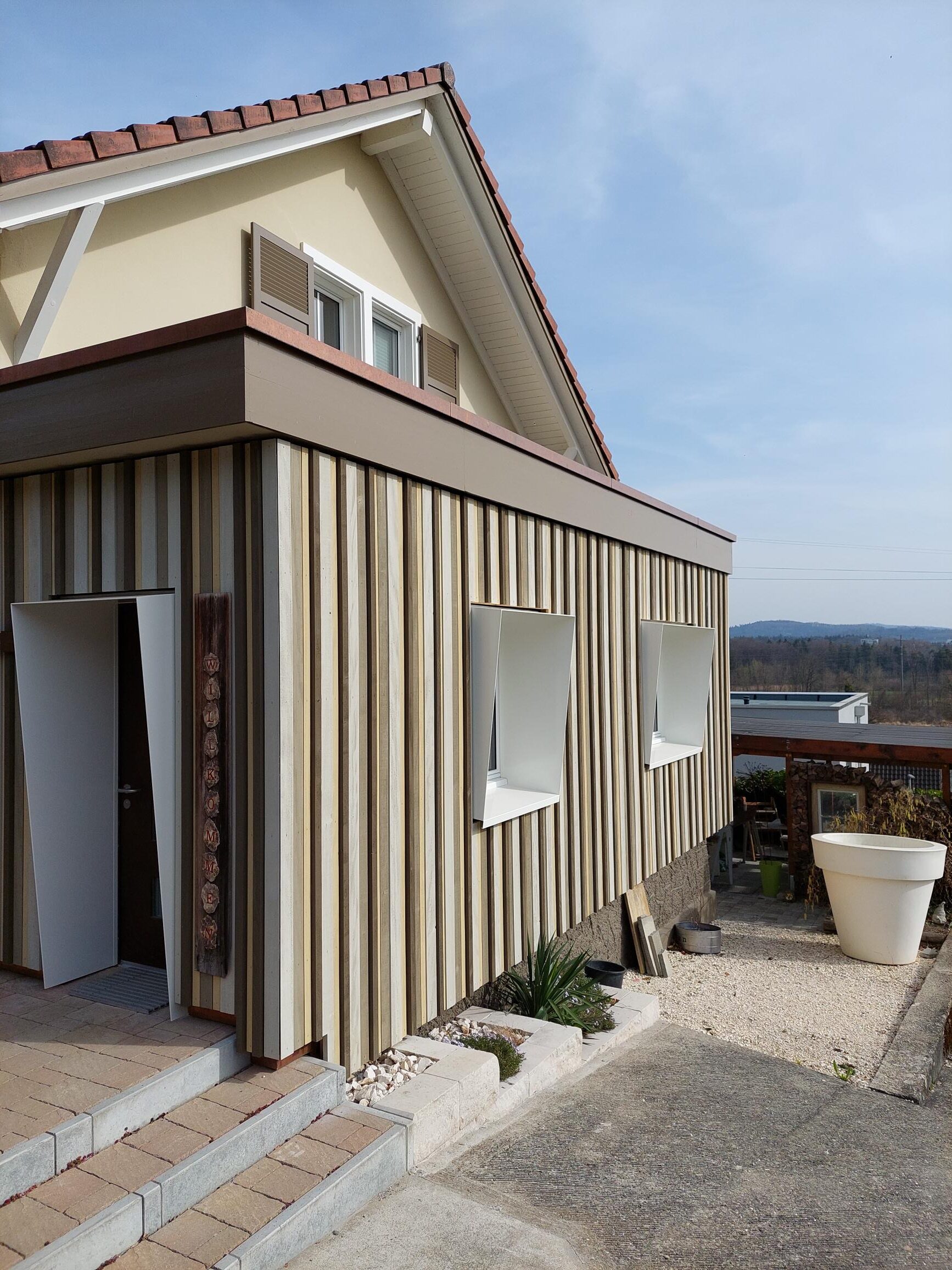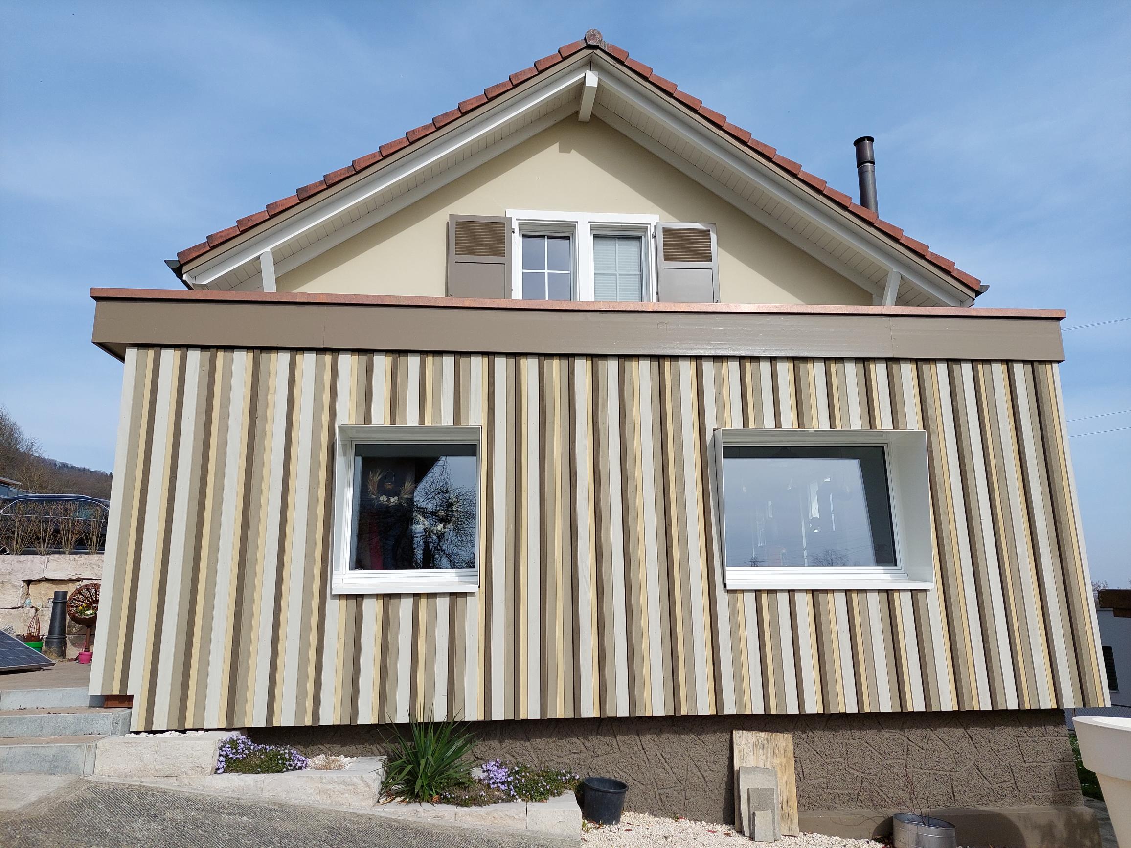 Durch den Anbau in Holzbauweise konnte die Bauherrschaft ihren Wohnraum erweitern und besser Ausnutzen als vorher. So dient der neue Anbau als Haupteingang. Mit der Holzbaufassade aus verschiedenen Farben und Profilstärken wurde dem Anbau eine persönliche Note gegeben.