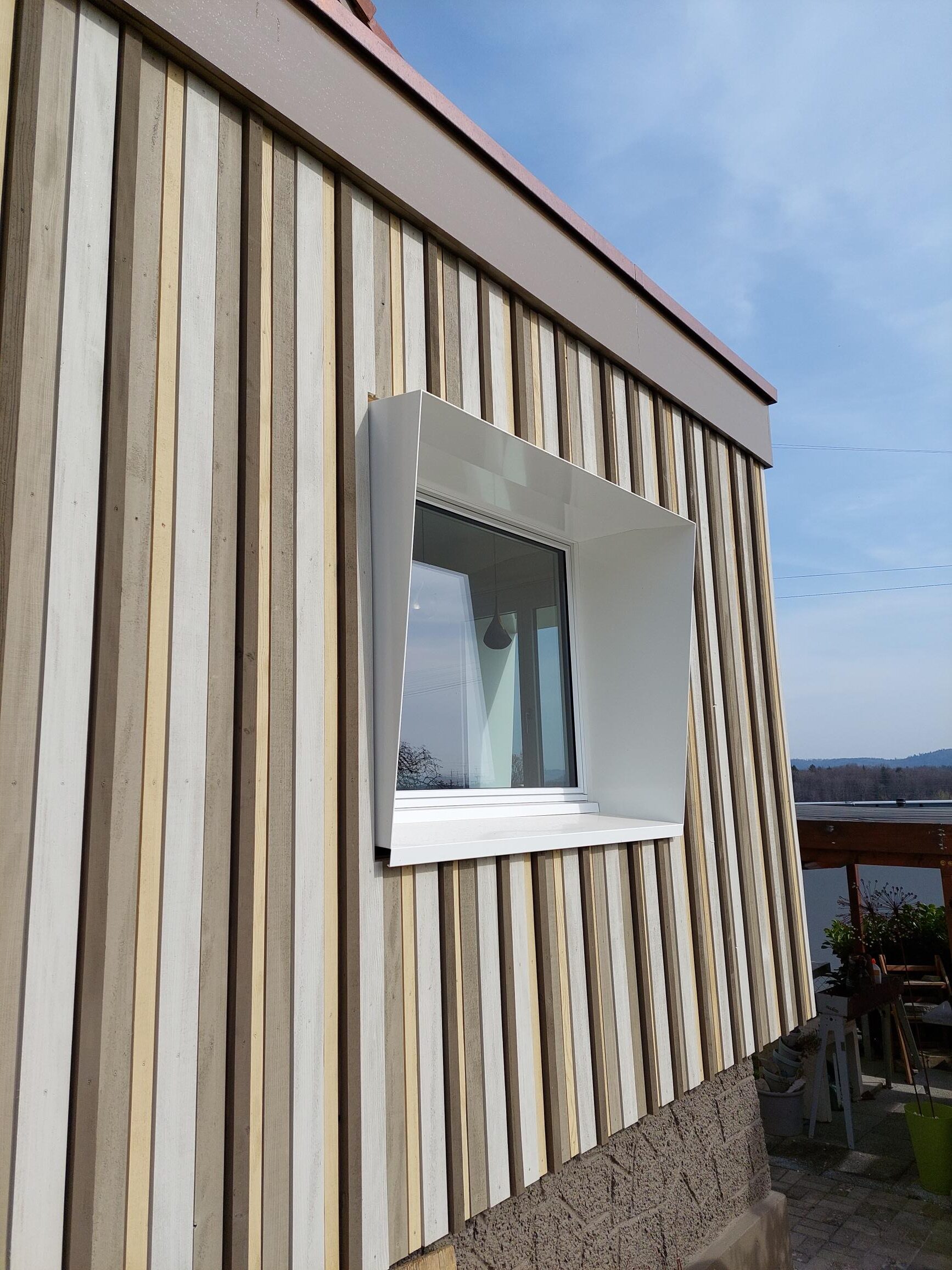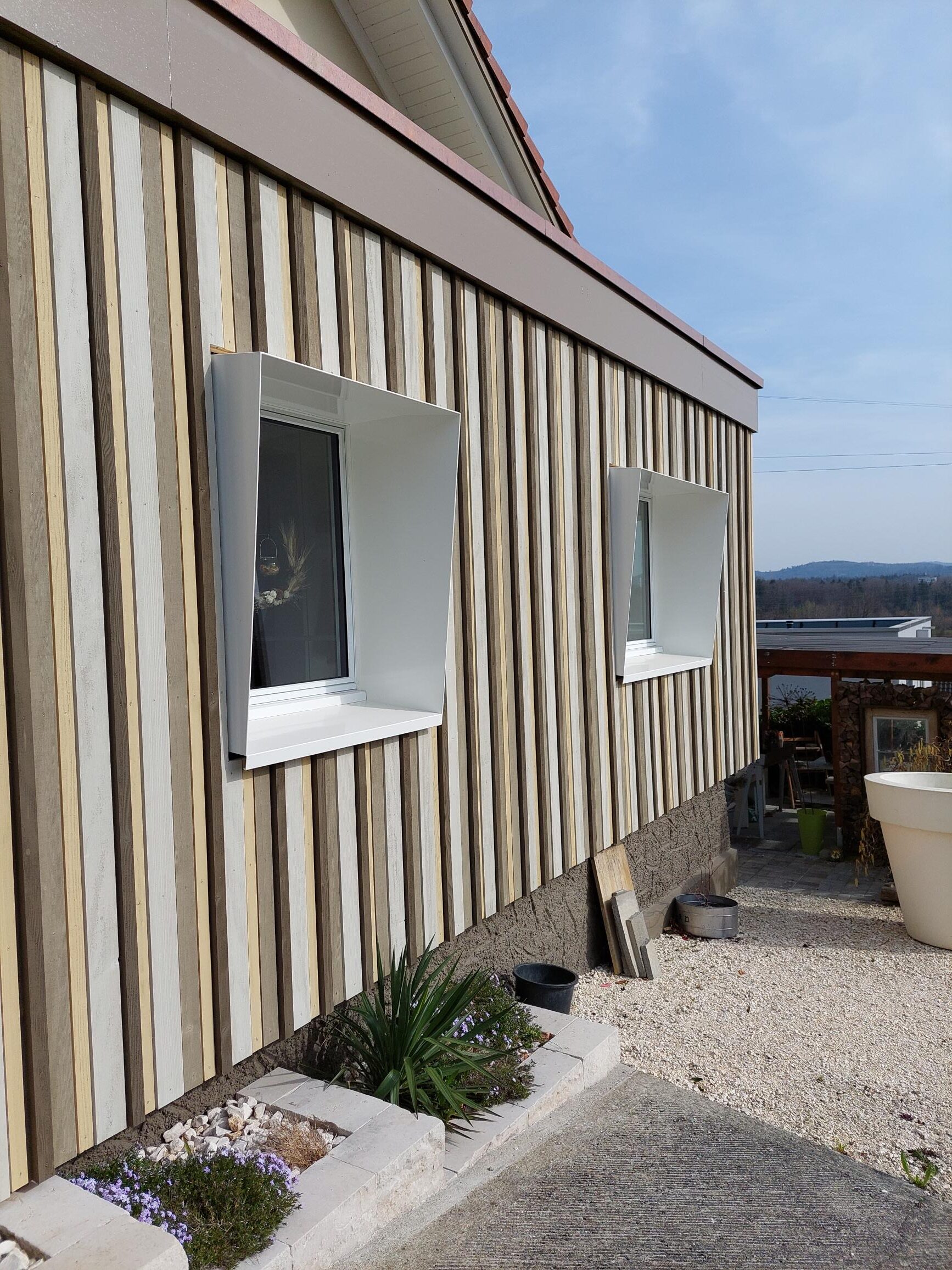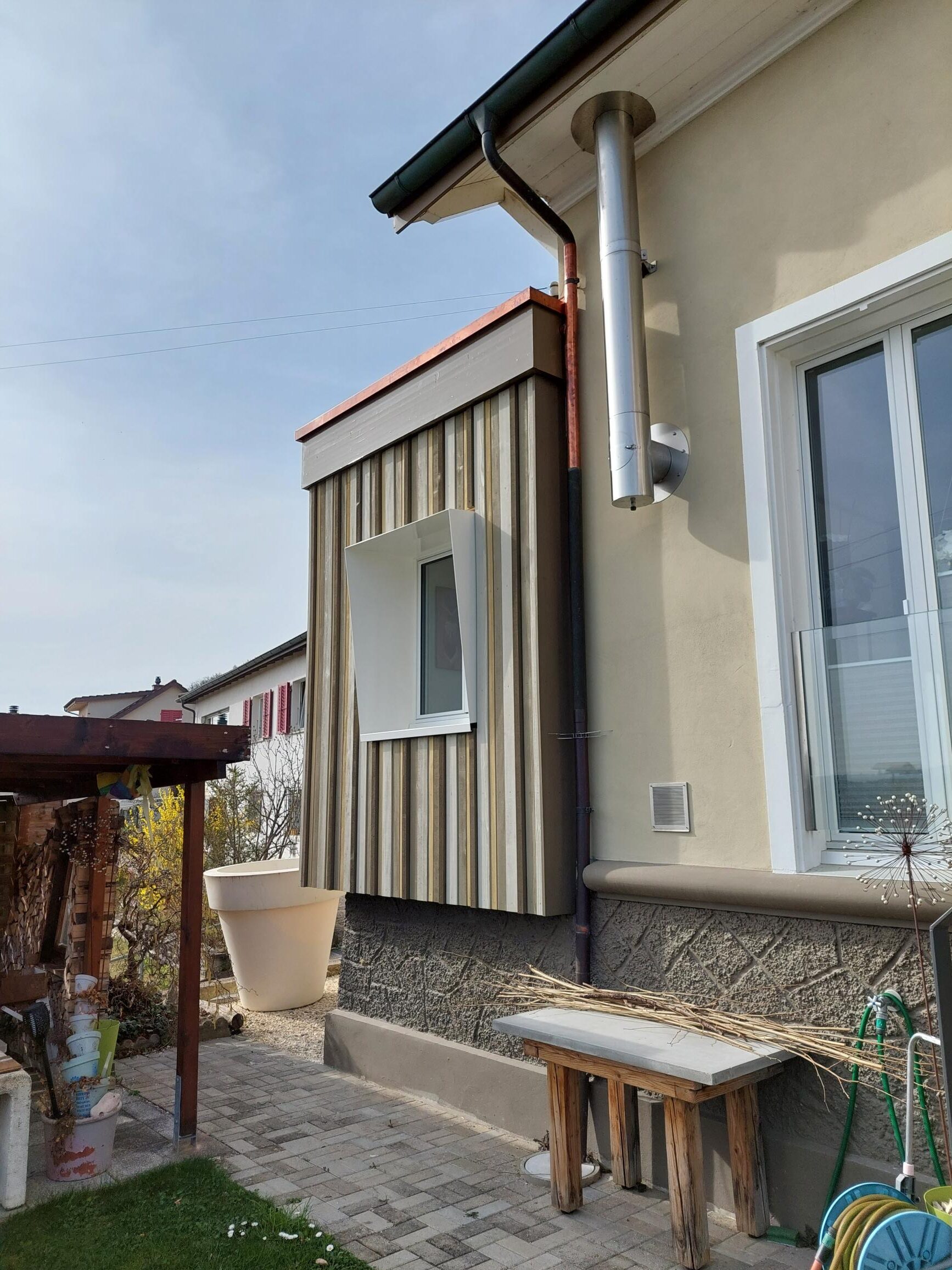 Durch den Anbau in Holzbauweise konnte die Bauherrschaft ihren Wohnraum erweitern und besser Ausnutzen als vorher. So dient der neue Anbau als Haupteingang. Mit der Holzbaufassade aus verschiedenen Farben und Profilstärken wurde dem Anbau eine persönliche Note gegeben.